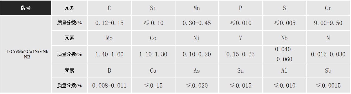 13Cr9Mo2Co1NiVNbNB属于马氏体耐热钢,其拥有较高的强度性能和良好的蠕变性能,为超超临界汽轮机蒸汽温度超过620℃对高强度耐热钢有更高的要求研制开发出来的,用于超超临界机组的中高压转子等关键部件。